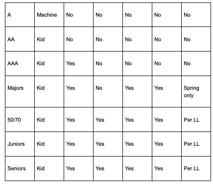 • (AA, AAA, Majors) Catcher with 4+ innings caught may not pitch that day per Little League Regulation VI(c))